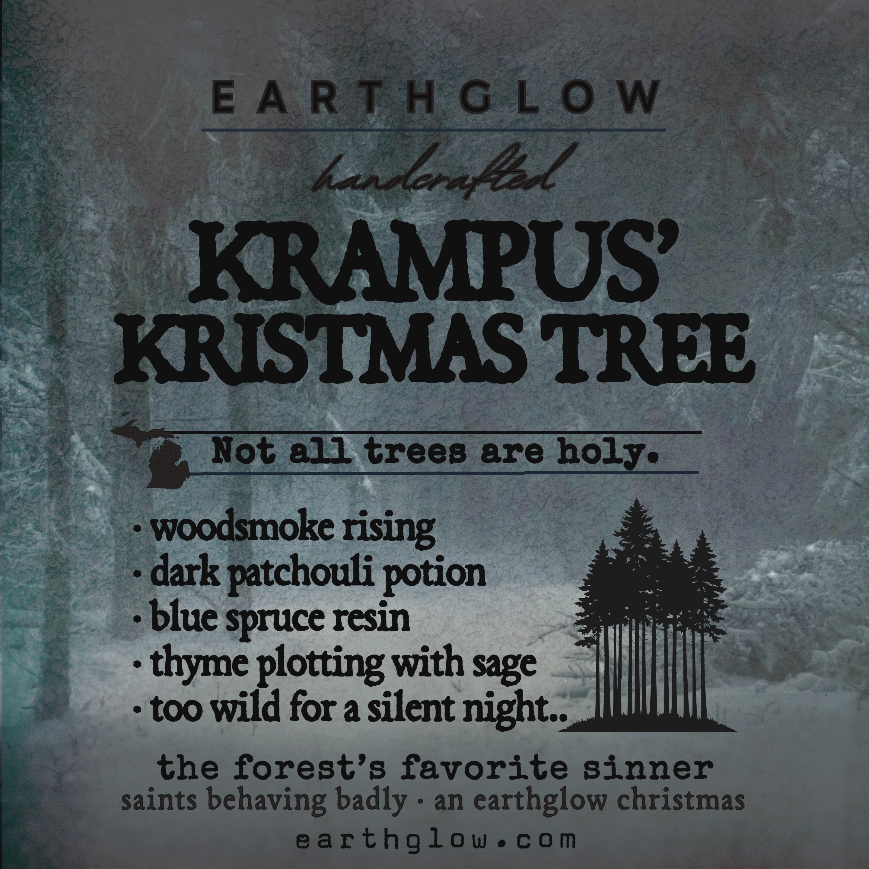 Deep in the pines, Krampus resides. A faint trail of footprints in the snow leads to his lair—enter if you dare. Inside, he crafts his spells and tends to his peculiar tree, herbs and all. Sage whispers with thyme, patchouli hums low in the shadows, and blue spruce sharpens the air. It’s the forest’s version of a dare: beautiful, strange, and far too wild for a silent night.
